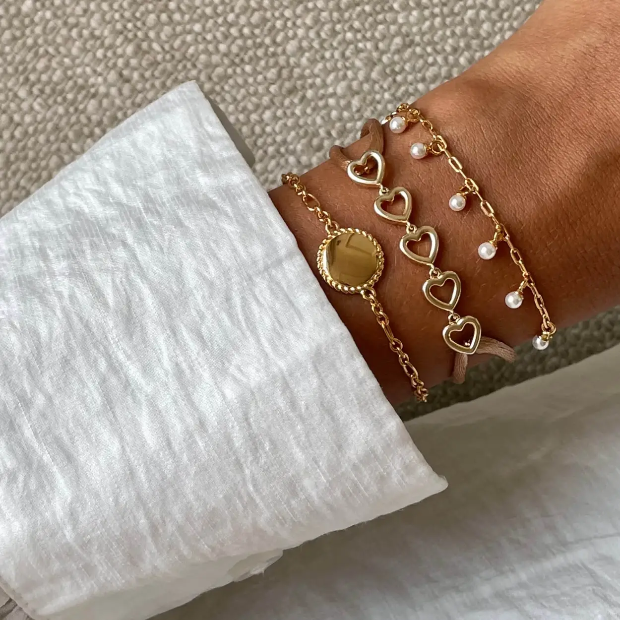 The heart family! This bracelet has a beige satin cord, a heart-shaped chain, and goes perfectly with the matching necklace, earrings and ring. All 24Kae jewelry is designed by Kae Sutherland with love and an eye for detail. So don't forget to treat them with love too. Each 24Kae necklace is characterized by its authenticity through a unique handmade charm with engraving and a touch of beige.