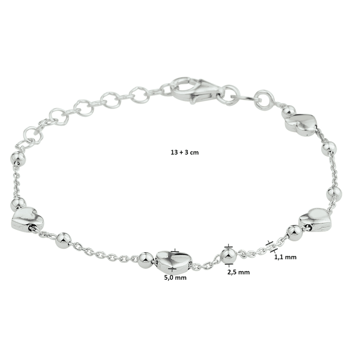 Gerhodineerd 925 zilveren armband uitgevoerd met bolletjes en schattige hartjes. De armband heeft een draaglengte van 13cm met een extensie van 3cm en een stevige karabijn sluiting. De hartjes hebben een afmeting van 5x5.5mm. De schakelbreedte is 2.5mm.