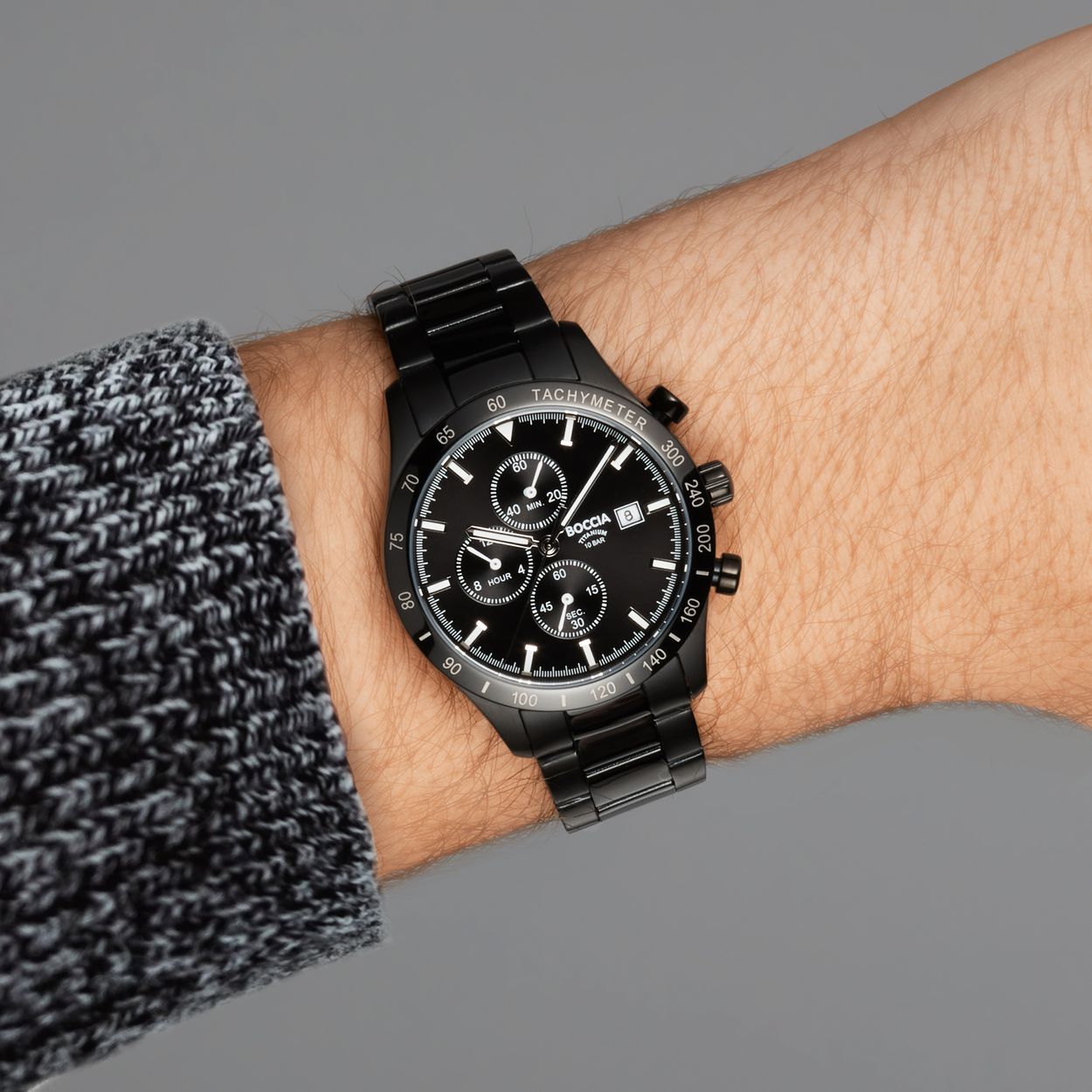 Dit herenhorloge van Boccia heeft een klassieke uitstraling en een sportief uiterlijk. De 3739-02 heeft een zwarte ronde titanium horlogekast met een diameter van 40mm, een bezel met tachymeter en een zwarte wijzerplaat met een chronograaf en een datum. Aan de titanium kast zit een zwarte mat glanzende titanium schakelband met vouwsluiting. Het horloge heeft een mineraalglas en is 10ATM. Of je nu sportief of chique gekleed gaat, dit horloge past bij elke outfit en iedere gelegenheid!