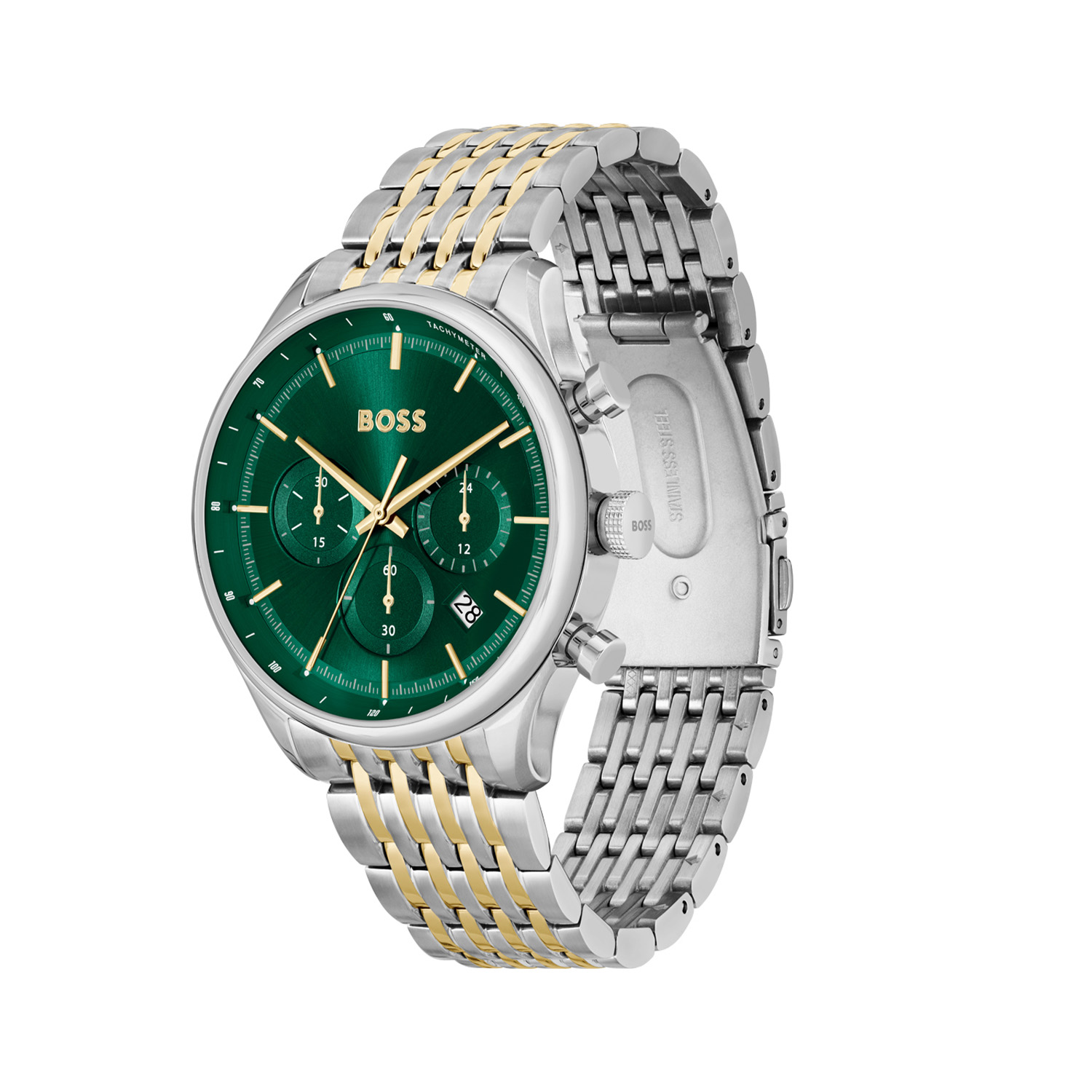 Dit BOSS horloge uit de GREGOR serie met artikelnr: HB1514081 heeft een luxe sportieve uitstraling. Zeer geschikt voor de moderne stijlvolle man van nu. Het herenhorloge valt op door zijn zilverkleurige stalen horlogekast met een gladde bezel en een groene wijzerplaat met een chrono en een dag,- en datumaanduiding. De fijne wijzers en de fijne uursaanduiding geven dit horloge een chique uitstraling. Aan de kast zit een bi-color stalen fijne schakelband met een vouwsluiting. De kast van het horloge heeft een doorsnee van 45mm met mineraalglas en is 5ATM.