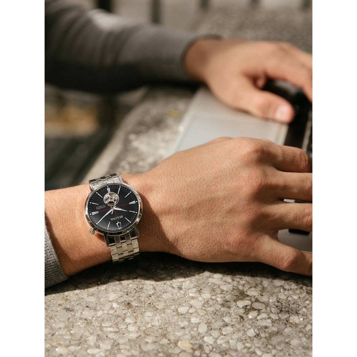 Dit automatisch horloge van het merk Bulova is een prachtig horloge. Het horloge heeft een kast gemaakt van staal en een zilverkleurige band gemaakt van staal. Dit horloge is goed om te doen door de vouwsluiting