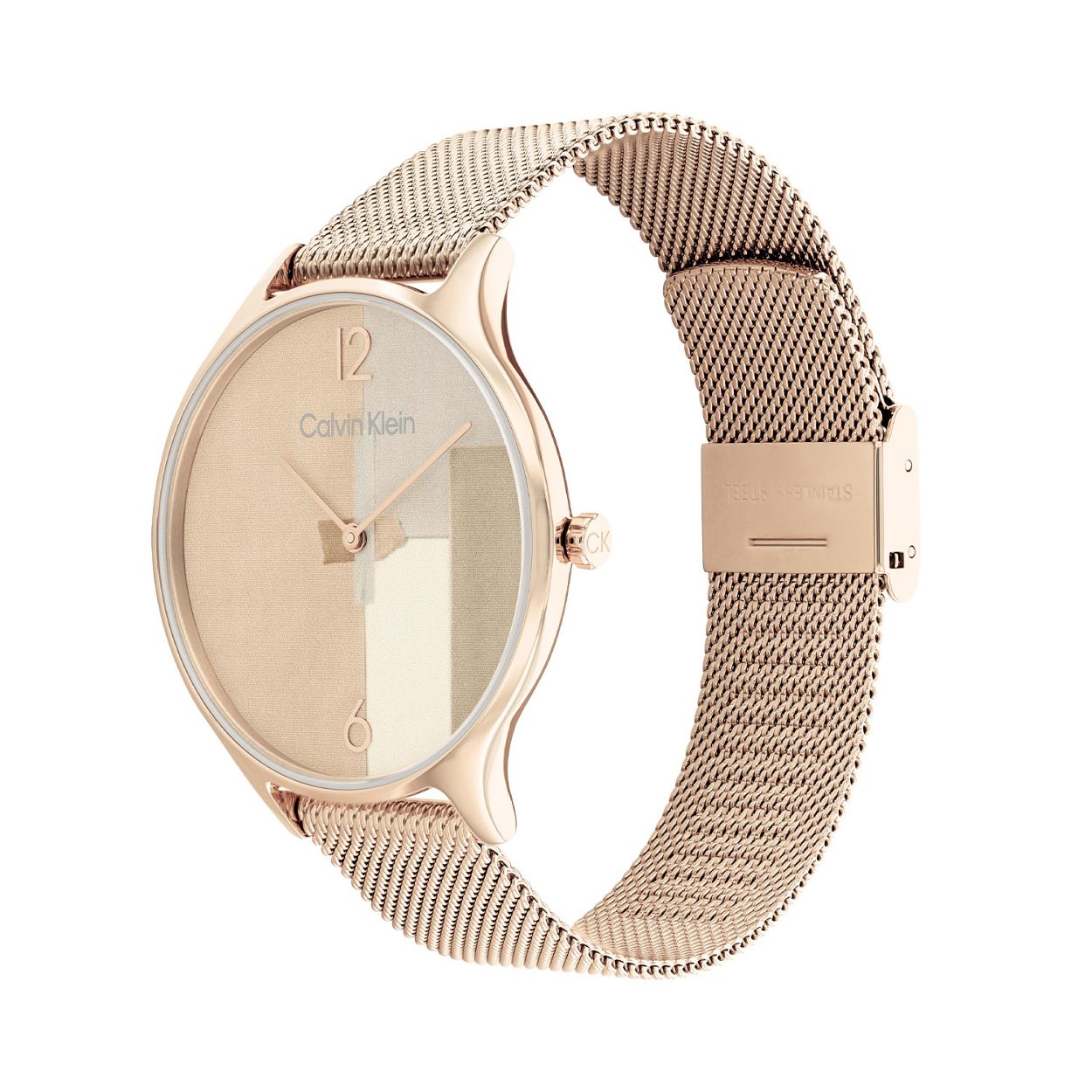 Dit Calvin Klein dameshorloge met nr CK25200006 heeft een strak en minimalistisch ontwerp. De stijlvolle ronde gladde stalen kast heeft een bruin beige gekleurde bewerkte wijzerplaat met alleen de 12 en 6 aanduiding, de merknaam, en hele fijne wijzers. Aan de ros�kleurige kast zit een ros�kleurige milanese band, dat geeft een chique uiterlijk. Het strakke horloge heeft een mineraalglas, een doorsnee van 38mm en is 3 ATM.