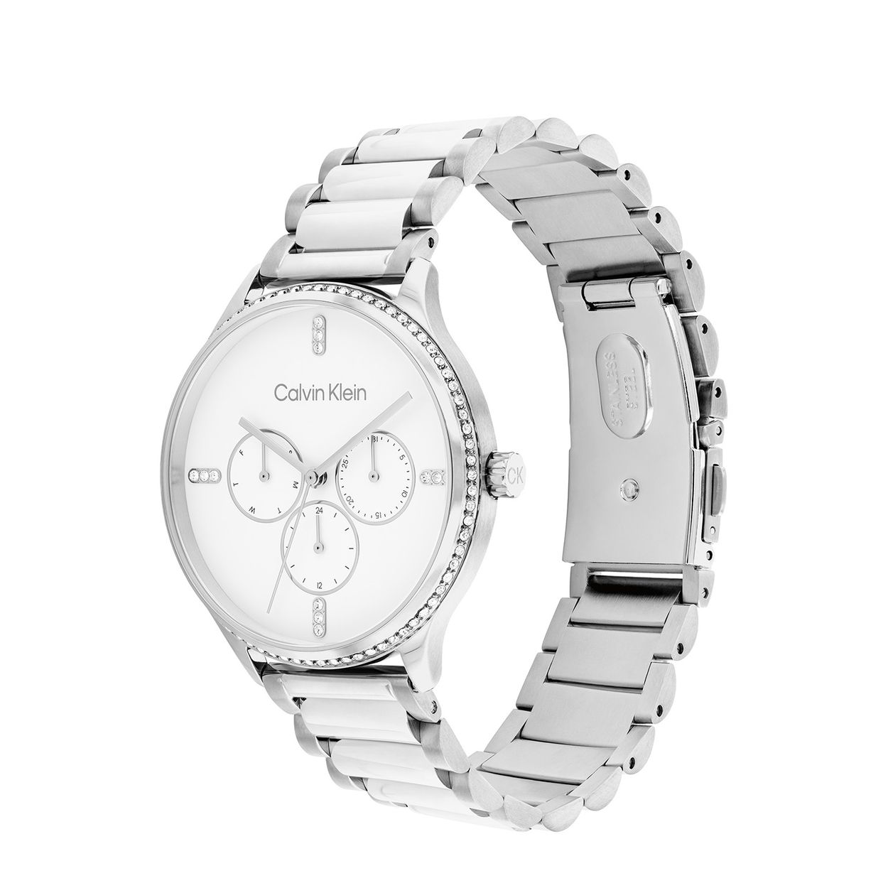 Dit Calvin Klein dameshorloge met nr CK25200373 is een sportief en chique ontwerp. De stijlvolle zilverkleurige ronde gladde stalen kast heeft een rand met kristallen, een zilverkleurige sunray wijzerplaat met op de 3, 6, 9 en op de 12 kristallen als uurs-aanduiding. Op de wijzerplaat is de dag,- datum en 24-uursaanduiding fijn aangegeven. Aan de zilverkleurige kast zit een zilverkleurige schakelband. Het sierlijke horloge heeft een mineraalglas, een doorsnee van 38mm en is 3 ATM.
