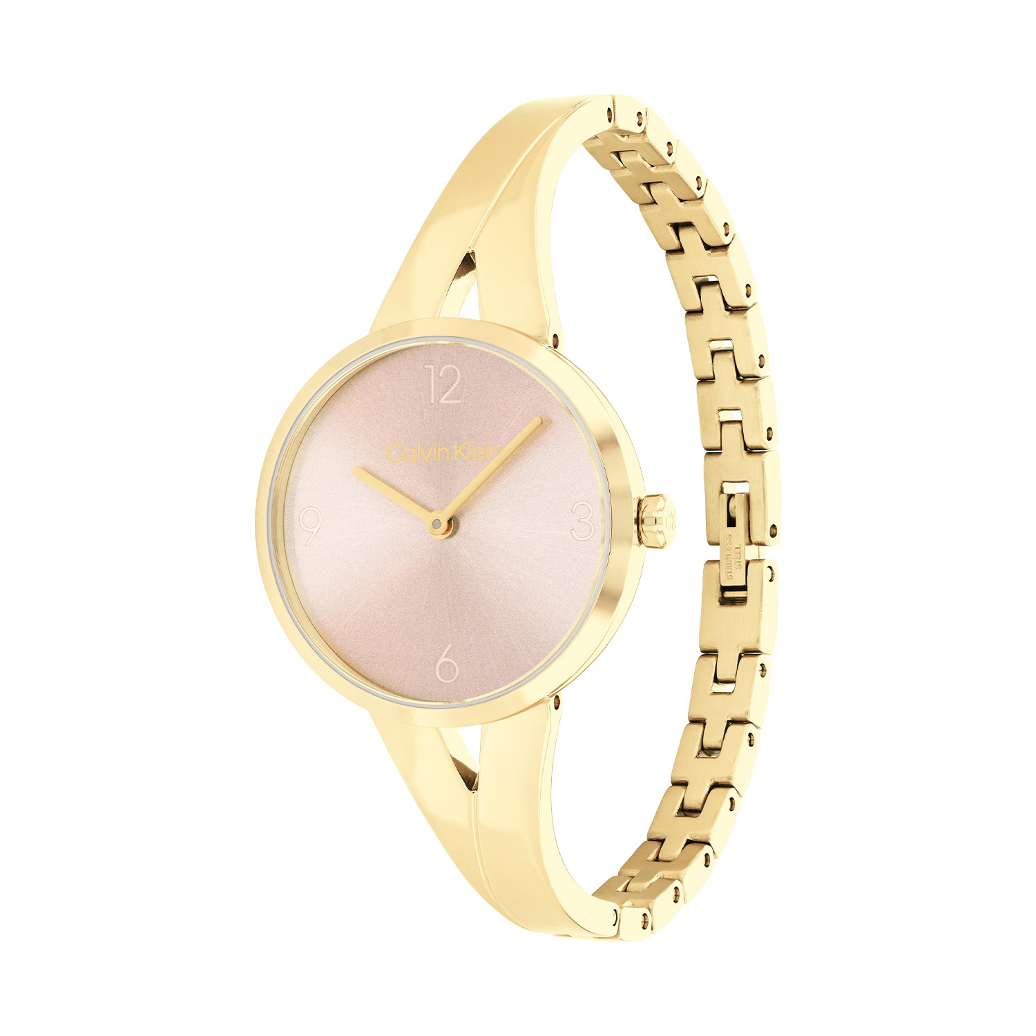 Dit Calvin Klein dameshorloge met nr CK25100027 is een chique en minimalistisch ontwerp. De stijlvolle ronde stalen goudkleurige kast heeft een gladde bezel en een blush wijzerplaat met hele fijne uursaanduiding. Aan het horloge zit een speciaal gevormde spangband die aan de onderkant overloopt in schakels. Het sierlijke horloge heeft een mineraalglas, een doorsnee van 30mm en is 3ATM.