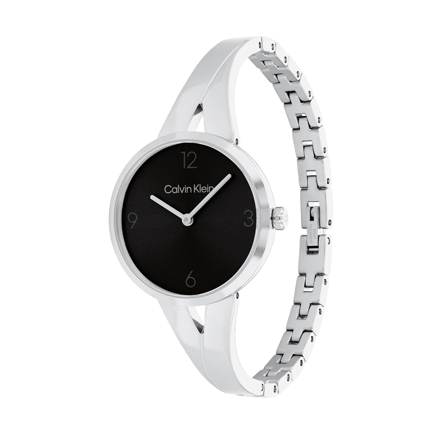 Dit Calvin Klein dameshorloge met nr CK25100026 is een chique en minimalistisch ontwerp. De stijlvolle ronde stalen kast heeft een gladde bezel en een zwarte wijzerplaat met hele fijne uursaanduiding. Aan het horloge zit een speciaal gevormde spangband die aan de onderkant overloopt in schakels. Het sierlijke horloge heeft een mineraalglas, een doorsnee van 30mm en is 3ATM.