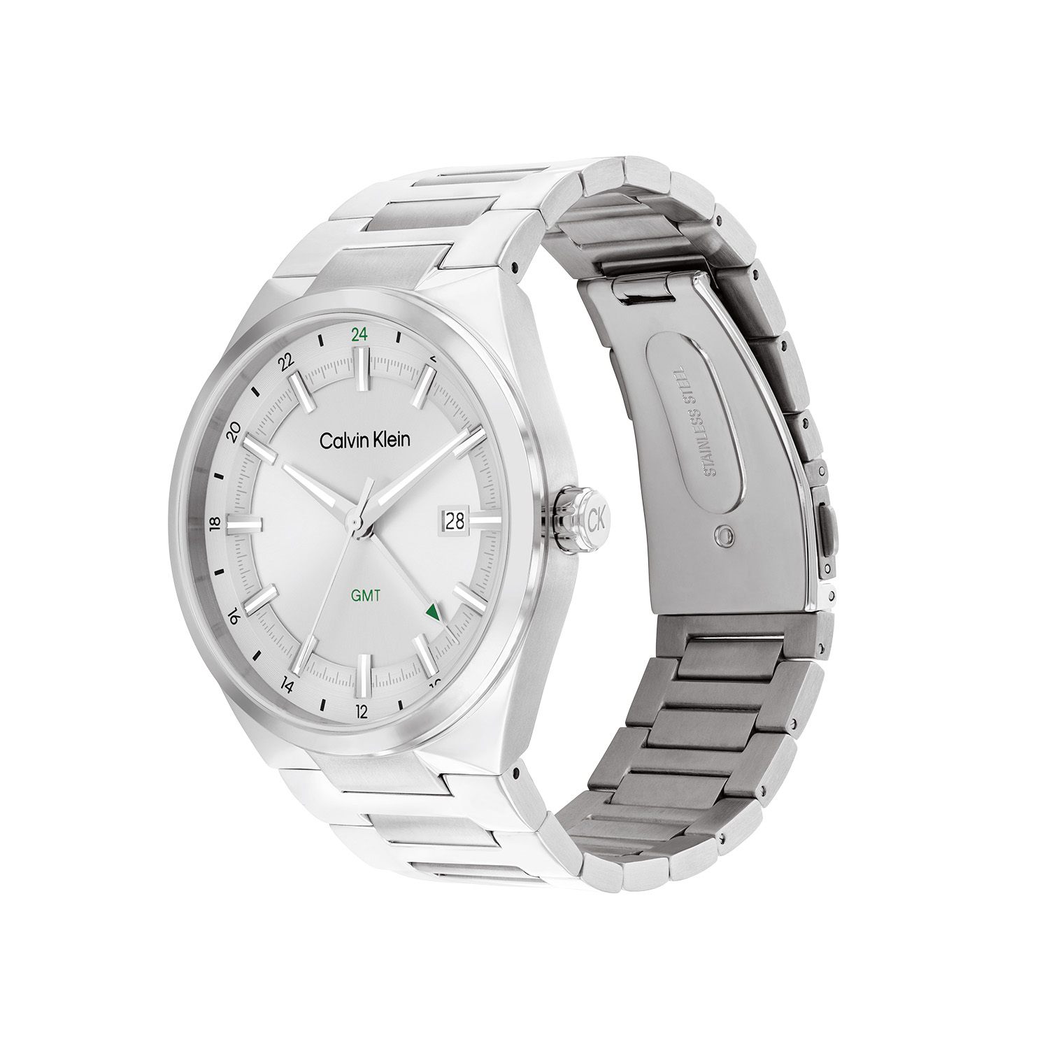 Dit Calvin Klein herenhorloge met nr CK25200489 is een stoer ontwerp. De ronde stalen kast heeft een glimmende bezel en een grijze sunray wijzerplaat met een datum en een dubbele tijdsaanduiding, een GMT uurwerk. De wijzers en uurstrepen zijn ingelegd met lumibrite. Direcr aan de kast zit een stalen schakelband met een vouwsluiting. Het opvallende herenhorloge heeft een mineraalglas, een doorsnee van 44mm en is 3ATM.