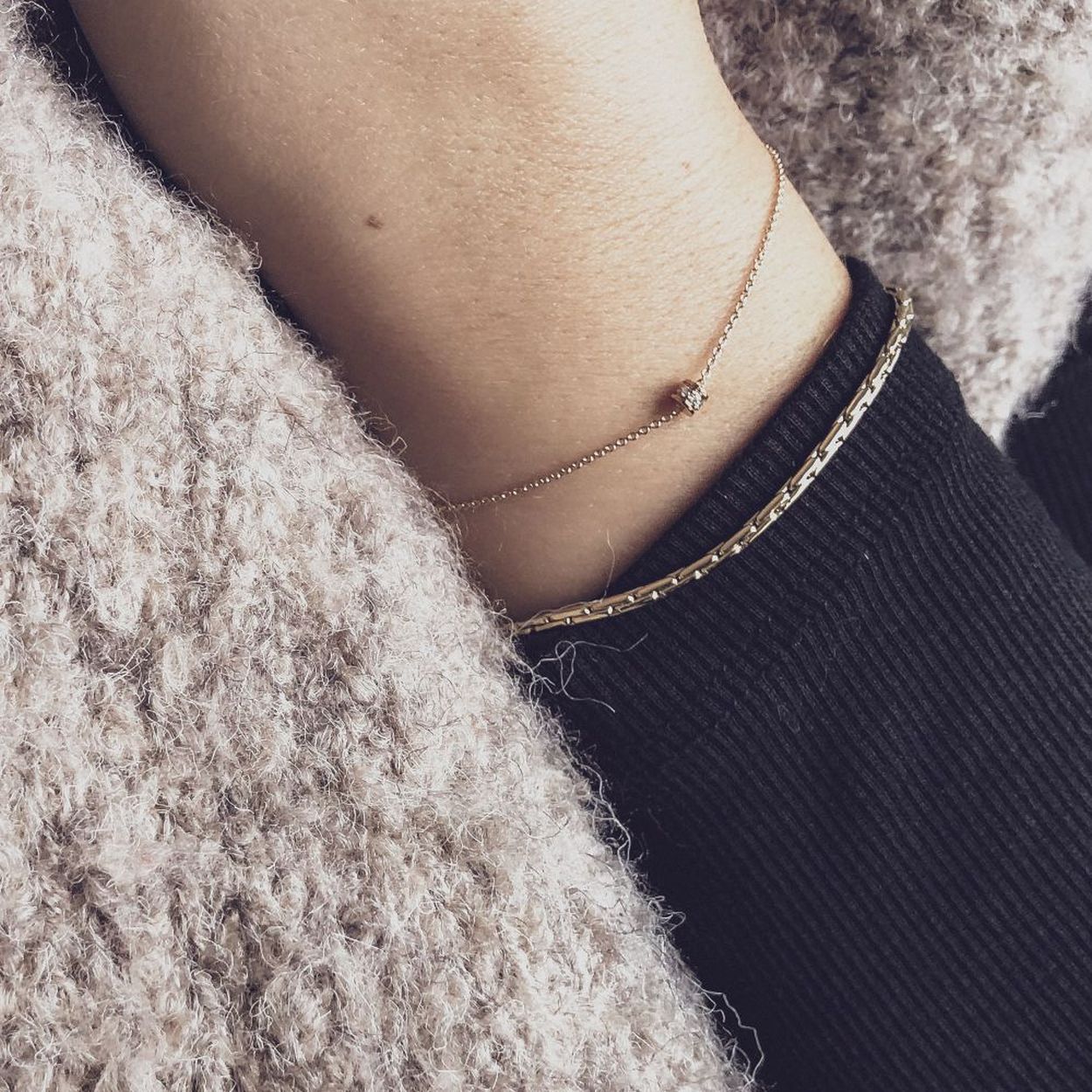 Geelgouden armband met 14 karaat gouden ankerschakel en 0.05 crt. briljant in een ronddraaiend tonnetje.