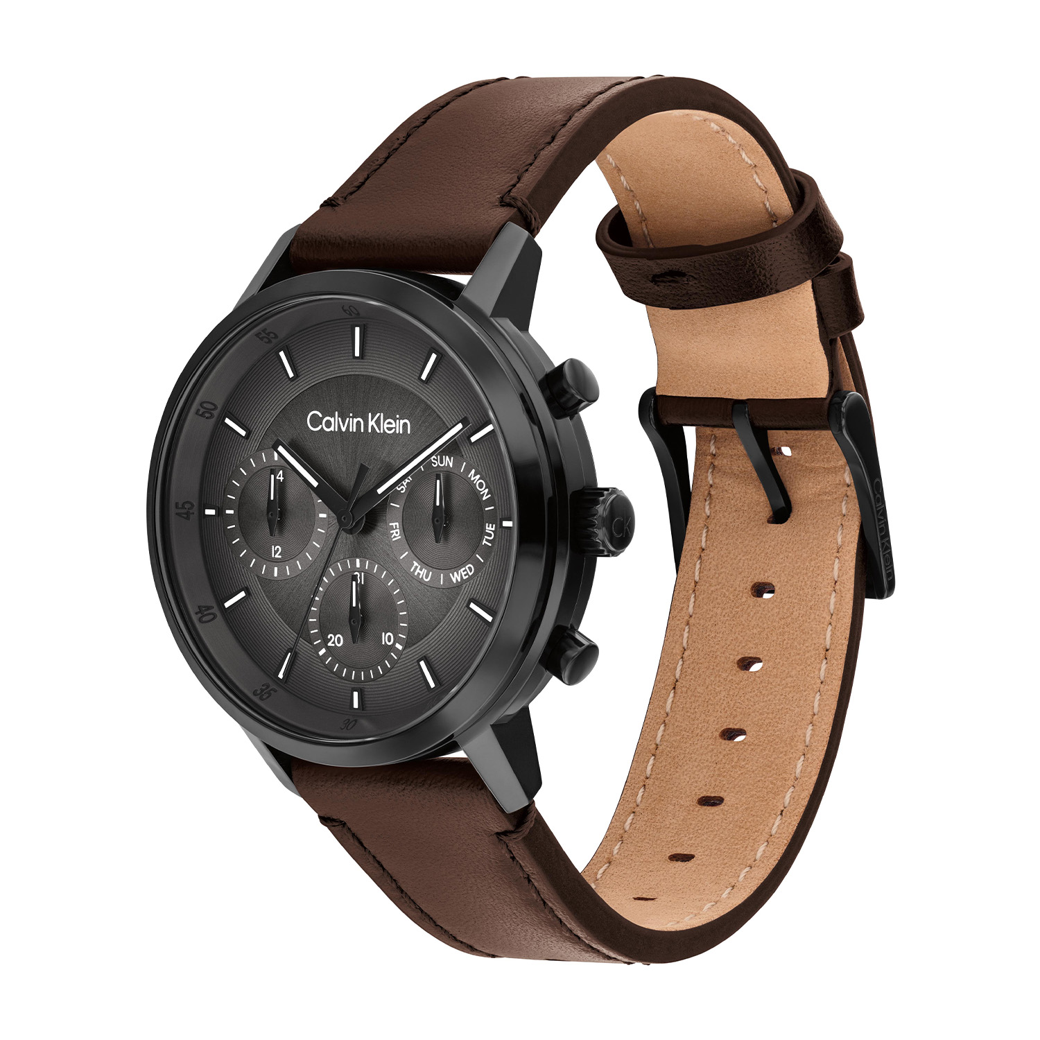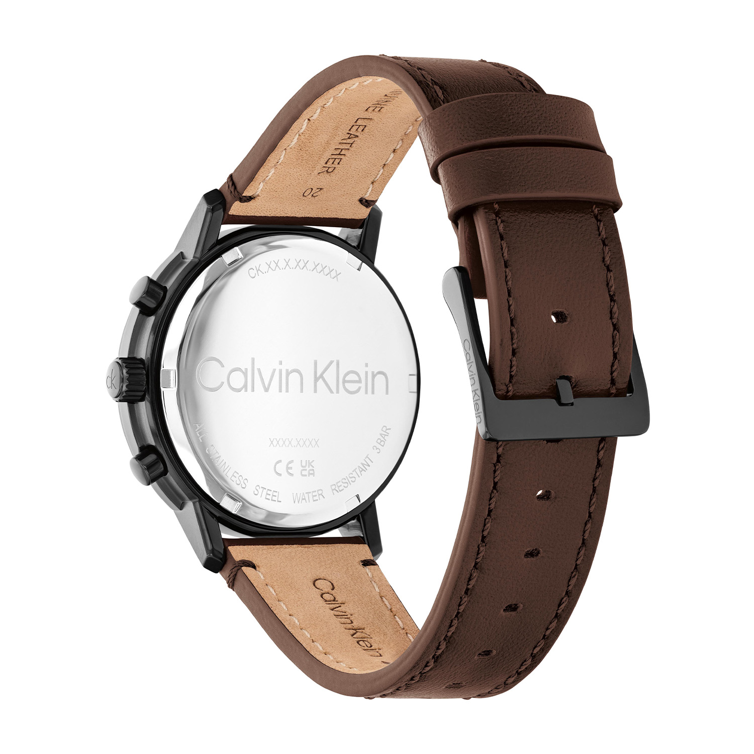 Dit Calvin Klein herenhorloge met nr CK25200498 is een stijlvol ontwerp. De ronde stalen zwarte kast heeft een glimmende bezel en een grijze geborstelde sunray wijzerplaat met een dag, datum en 24-uursaanduiding. Aan de kast zit een bruine lerenband met een gespsluiting. Het herenhorloge heeft een mineraalglas, een doorsnee van 41mm en is 3ATM.