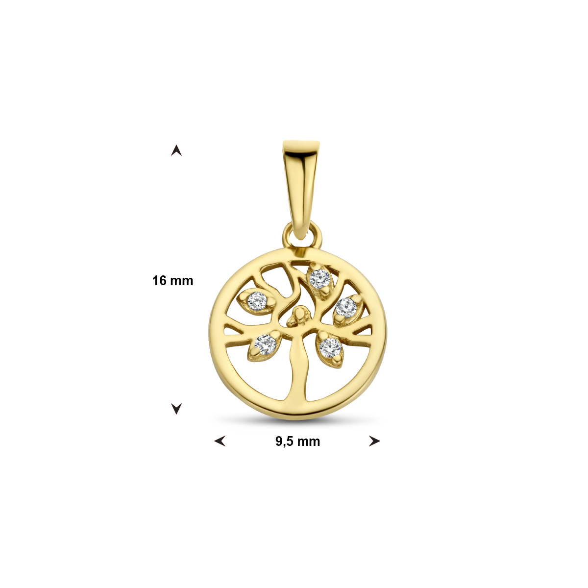 14k Geelgouden levensboom hanger met zirkonia. De hanger heeft een totale hoogte van 16mm.