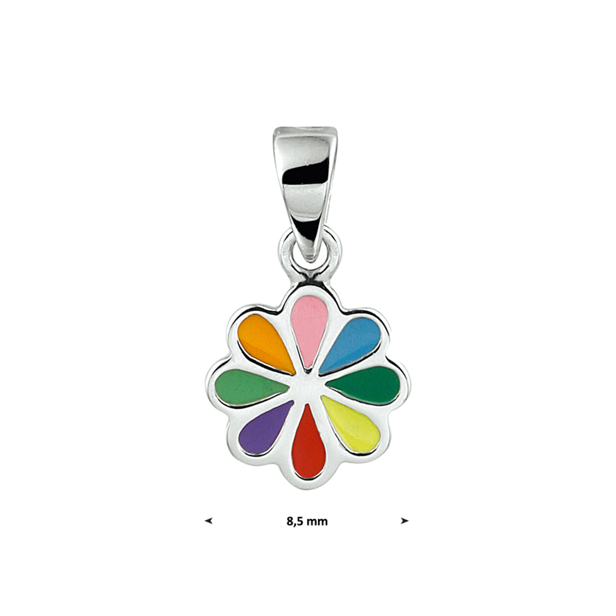 Gerhodineerd zilveren bloem hanger uitgevoerd met verschillende kleuren emaille. De hanger heeft een diameter van 8.5mm. U kunt deze hanger combineren met bijpassende sieraden of een collier uit onze collectie.