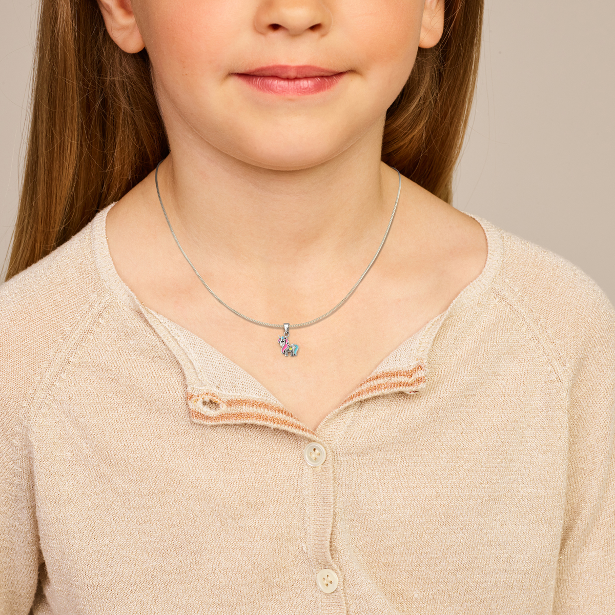 Gerhodineerd 925 zilveren hanger uitgevoerd in de vorm van een eenhoorn met gekleurd emaille. De hanger heeft een totale hoogte van 1.5cm en een breedte van 10mm.
