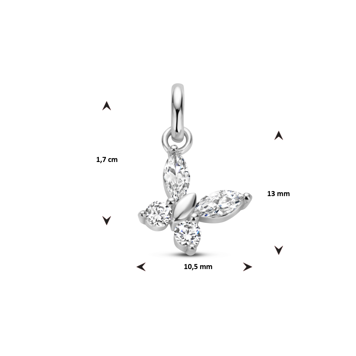 Gerhodineerd 925 zilveren hanger in de vorm van een vlinder met zirkonia. De hanger heeft een totale hoogte van 17mm.
