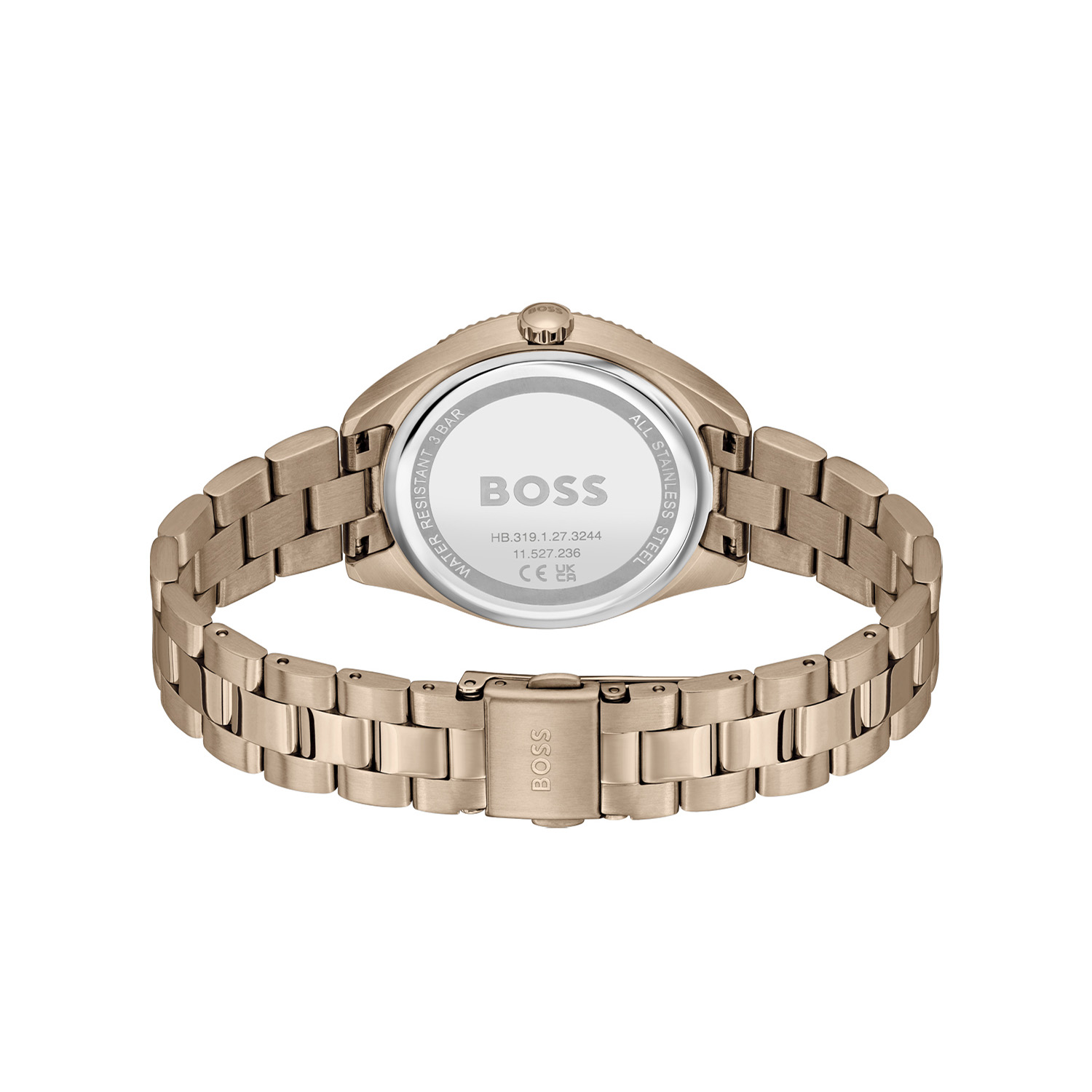 Dit BOSS horloge uit de SAGE SPORT serie met artikelnr: HB1502801 heeft een luxe uitstraling. Zeer geschikt voor de moderne stijlvolle vrouw van nu. Het dameshorloge valt op door zijn stalen beige horlogekast met een gekartelde bezel en een beige sunray wijzerplaat met een dag,- datum,- en 24-uursaanduiding. De wijzers en uurstrepen zijn fijn gefaceteerd. Aan de kast zit een stalen beige schakelband met een vouwsluiting. Het horloge heeft een doorsnee van 34mm een mineraalglas en is 3ATM.