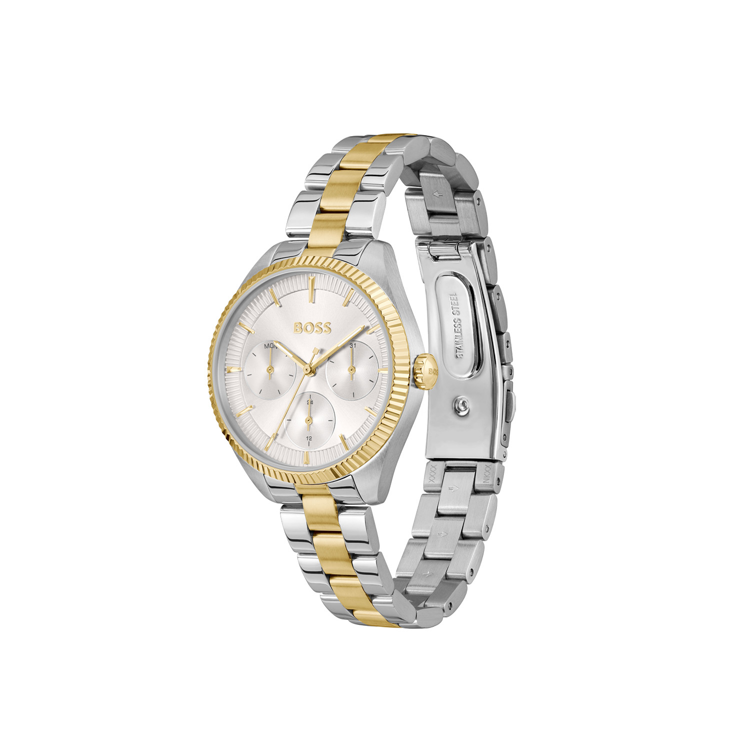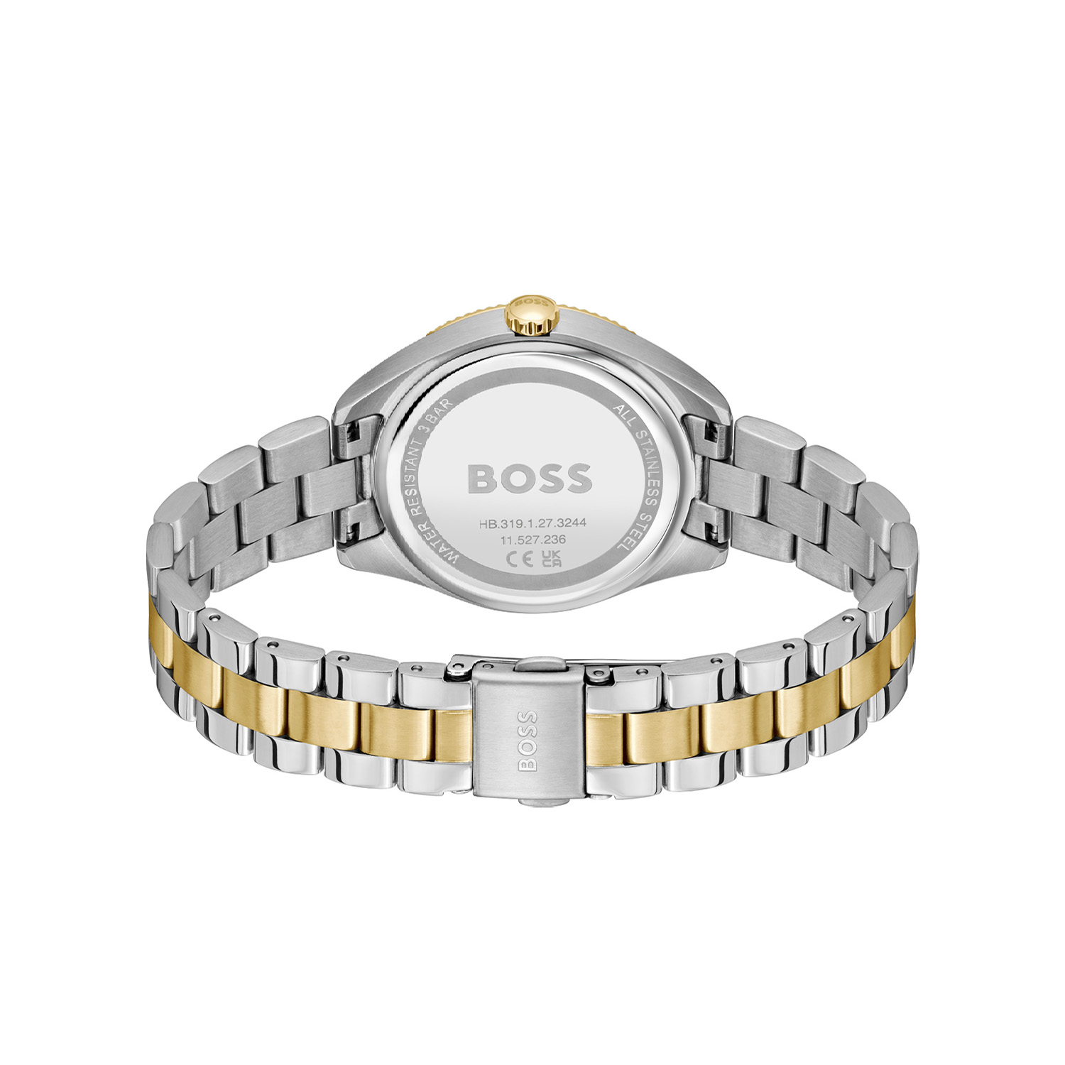 Dit BOSS horloge uit de SAGE SPORT serie met artikelnr: HB1502804 heeft een luxe uitstraling. Zeer geschikt voor de moderne stijlvolle vrouw van nu. Het dameshorloge valt op door zijn stalen horlogekast met een gekartelde goudkleurige bezel en een zilverwitte sunray wijzerplaat met een dag,- datum,- en 24-uursaanduiding. De wijzers en uurstrepen zijn fijn gefaceteerd. Aan de kast zit een stalen bicolor schakelband met een vouwsluiting. Het horloge heeft een doorsnee van 34mm een mineraalglas en is 3ATM.