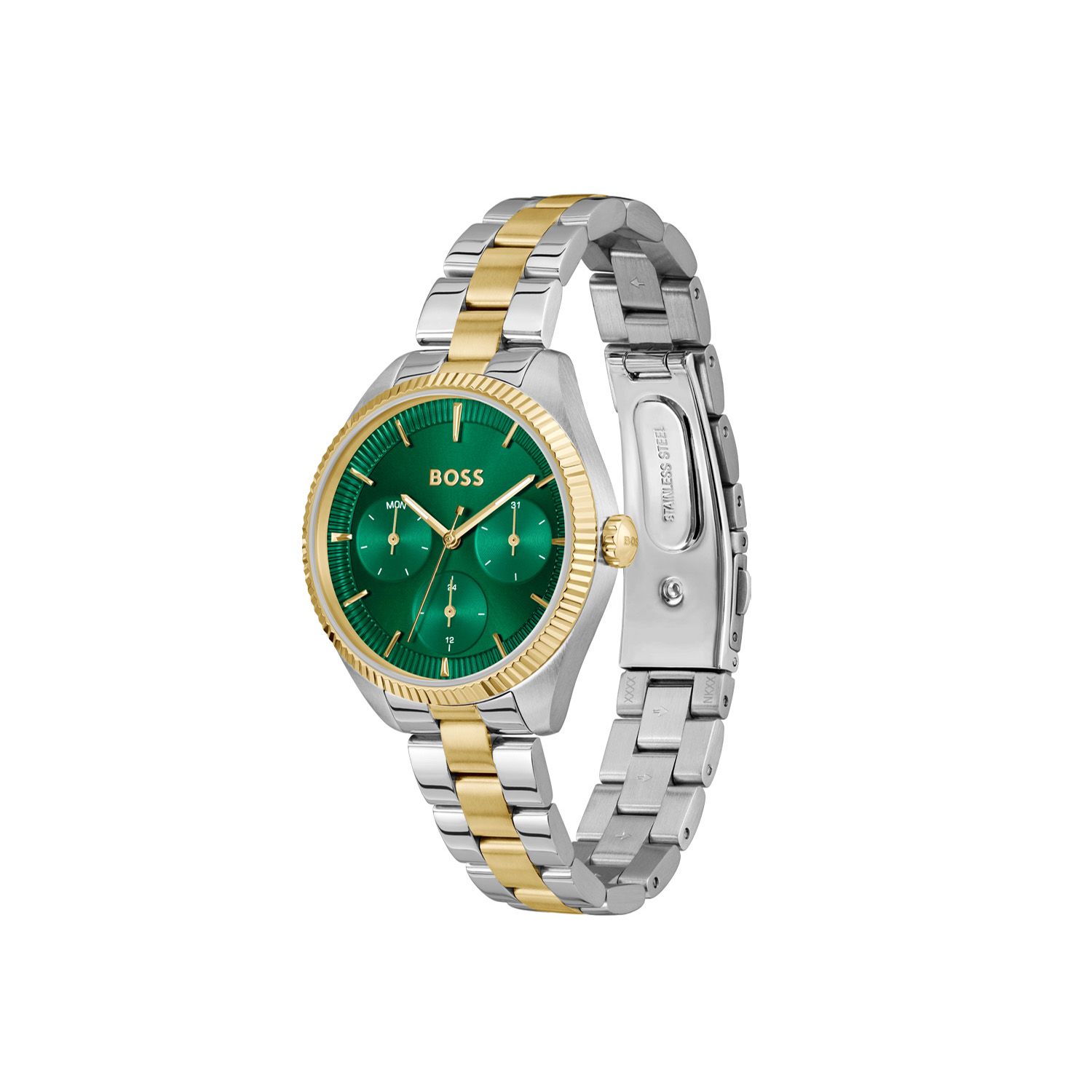 Dit BOSS horloge uit de SAGE SPORT serie met artikelnr: HB1502806 heeft een luxe uitstraling. Zeer geschikt voor de moderne stijlvolle vrouw van nu. Het dameshorloge valt op door zijn stalen horlogekast met een gekartelde goudkleurige bezel en een groene sunray wijzerplaat met een dag,- datum,- en 24-uursaanduiding. De wijzers en uurstrepen zijn fijn gefaceteerd. Aan de kast zit een stalen bicolor schakelband met een vouwsluiting. Het horloge heeft een doorsnee van 34mm een mineraalglas en is 3ATM.