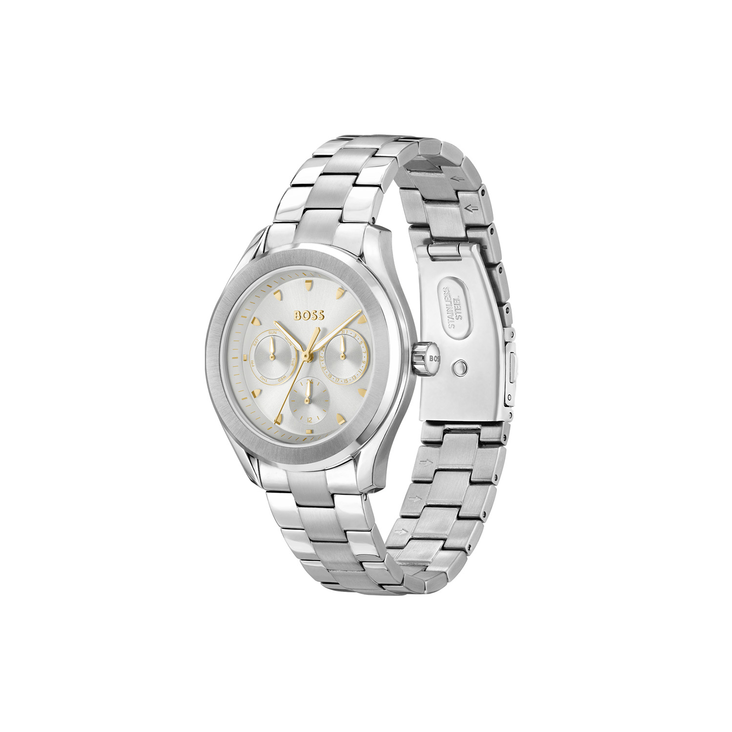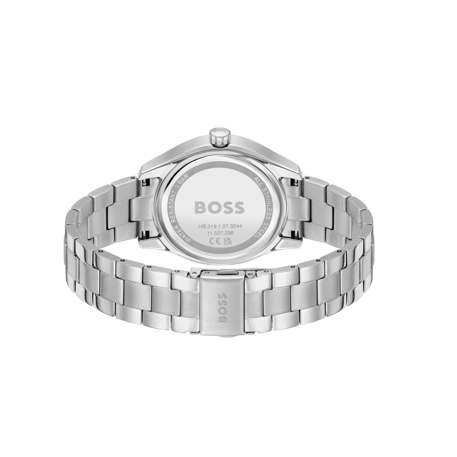 Dit BOSS horloge uit de LIDA serie met artikelnr: HB1502747 heeft een stijlvolle look. Zeer geschikt voor de moderne stijlvolle vrouw van nu. Het dameshorloge valt op door zijn stalen ronde horlogekast met een platte bezel en een grijze sunray wijzerplaat met dag, datum, en 24-uursaanduiding. Aan de kast zit een stalen schakelband met vouwsluiting. De kast van het horloge heeft een doorsnee van 38mm met mineraalglas en is 3ATM.