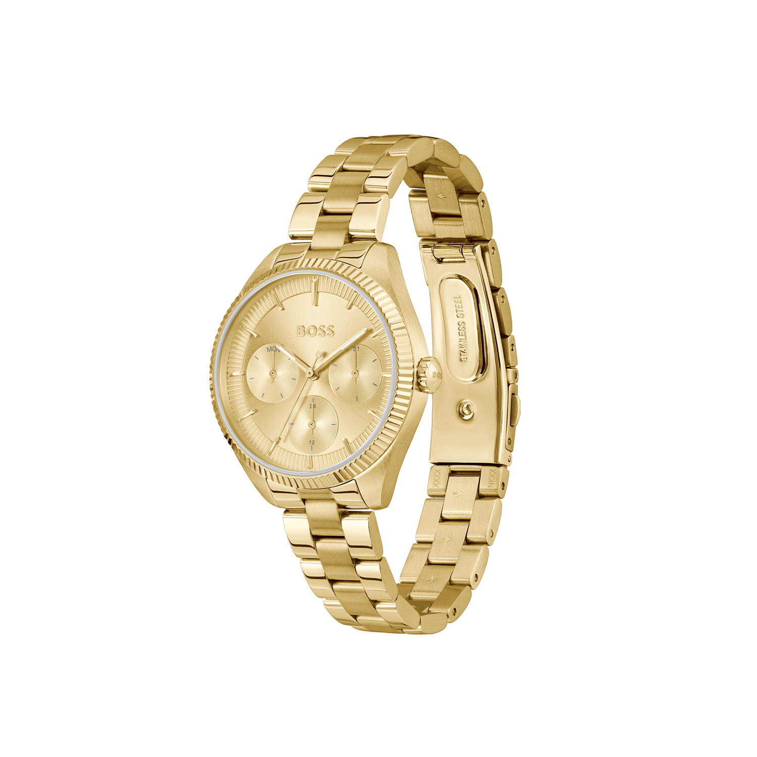 Dit BOSS horloge uit de SAGE SPORT serie met artikelnr: HB1502803 heeft een luxe uitstraling. Zeer geschikt voor de moderne stijlvolle vrouw van nu. Het dameshorloge valt op door zijn stalen goudkleurige horlogekast met een gekartelde goudkleurige bezel en een goudkleurige sunray wijzerplaat met een dag,- datum,- en 24-uursaanduiding. De wijzers en uurstrepen zijn fijn gefaceteerd. Aan de kast zit een stalen goudkleurige schakelband met een vouwsluiting. Het horloge heeft een doorsnee van 34mm een mineraalglas en is 3ATM.