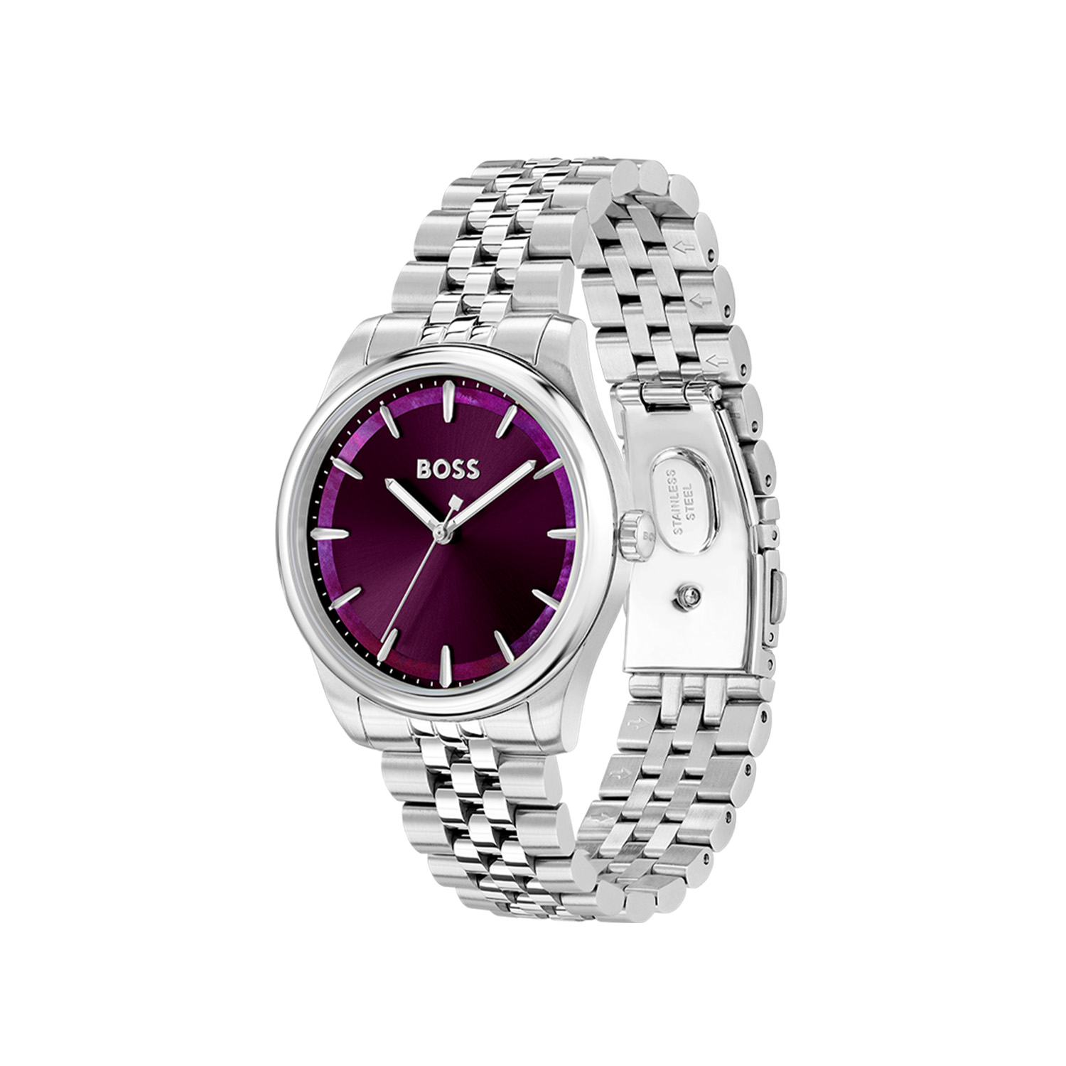 Dit BOSS horloge uit de GRACEFUL serie met artikelnr: HB1502778 heeft een luxe uitstraling. Zeer geschikt voor de moderne stijlvolle vrouw van nu. Het dameshorloge valt op door zijn stalen horlogekast met een gladde bezel en een paarse sunray wijzerplaat met een parelmoer buitenrand. Opvallend zijn de fijne wijzers en het strakke BOSS logo. Aan de kast zit een stalen mat glanzende schakelband met een vouwsluiting. Het horloge heeft een doorsnee van 36mm met een mineraalglas en is 3ATM.