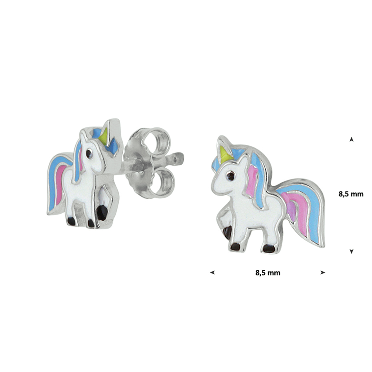 Beschrijving: Schattige gerhodineerd zilveren fantasie eenhoorn oorknoppen met een afmeting van 8.5x8.5mm. Deze oorknoppen zijn perfect te combineren met bijpassende sieraden uit onze collectie. Tip: Leuk om kado te geven zie je ze al stralen!? Info: Gerhodineerd zilver is door de rhodiumlaag beter bestand tegen verkleuren en krassen.