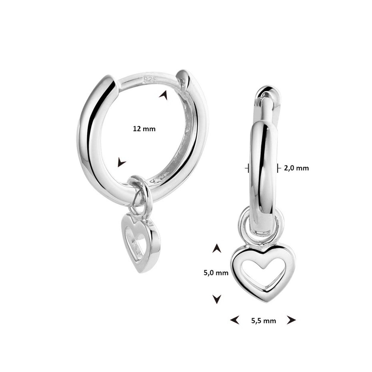 Gerhodineerd 925 zilveren oorringen uitgevoerd met een hangertje in de vorm van een hartje. De oorringen hebben een diameter van 12mm. De hartjes hebben een afmeting van5x5.5mm.