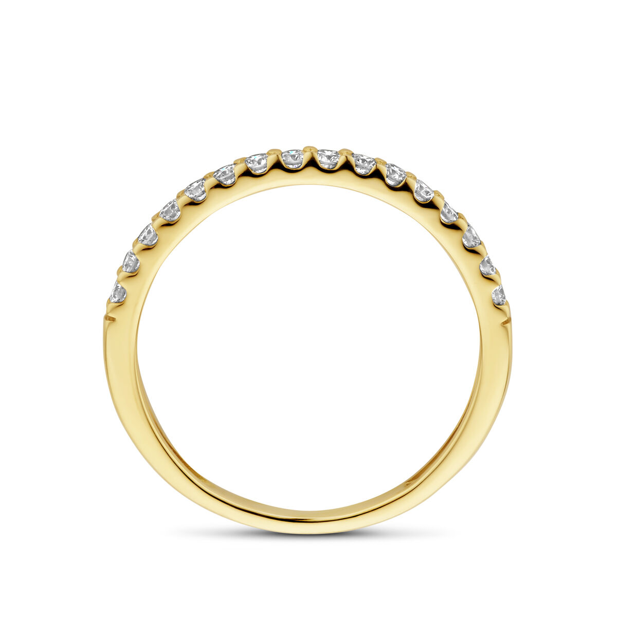 14k Geelgouden geelgouden ring uitgevoerd met lab grown diamant. De ring heeft een breedte van 2mm. Het totale diamantgewicht is 0.255ct. Lab grown diamanten zijn diamanten die ontstaan in een laboratorium. Onder extreem hoge druk en temperatuur wordt het natuurlijk ontstaansproces nagebootst met als eindresultaat een diamant met dezelfde chemische eigenschappen maar met een andere oorsprong.