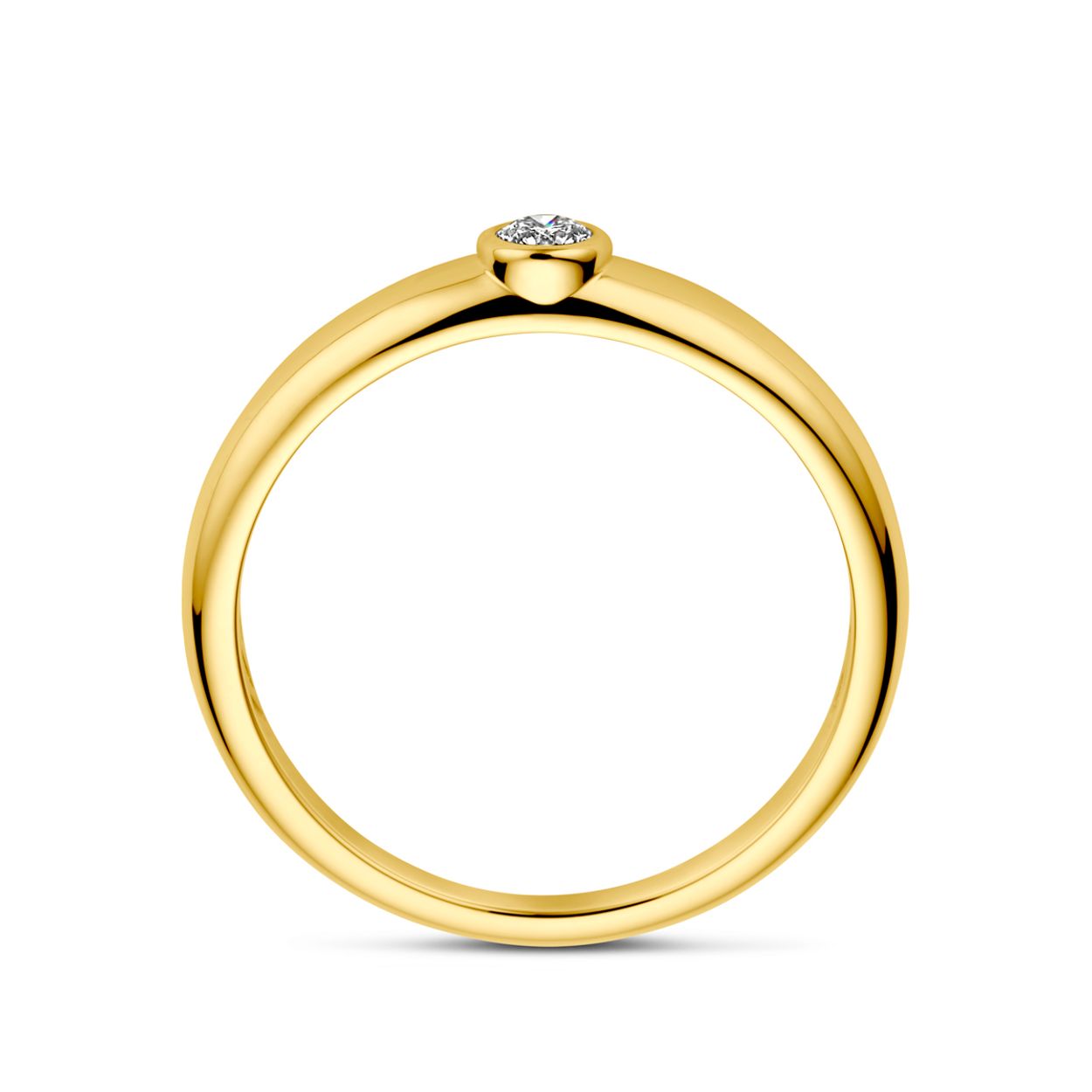 14k Geelgouden ring uitgevoerd met schitterende diamant. De ring heeft een breedte van 4mm.