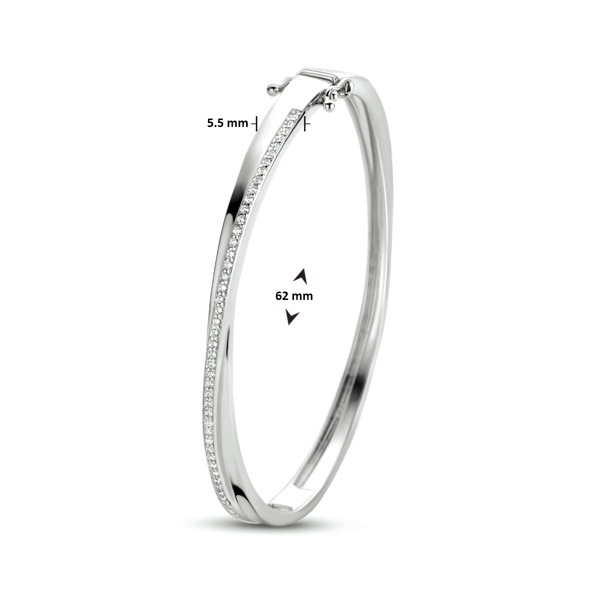 Gerhodineerd 925 zilveren bangle met een breedte van 5.5mm. De bangle is uitgevoerd met een schitterende zirkonia rij.