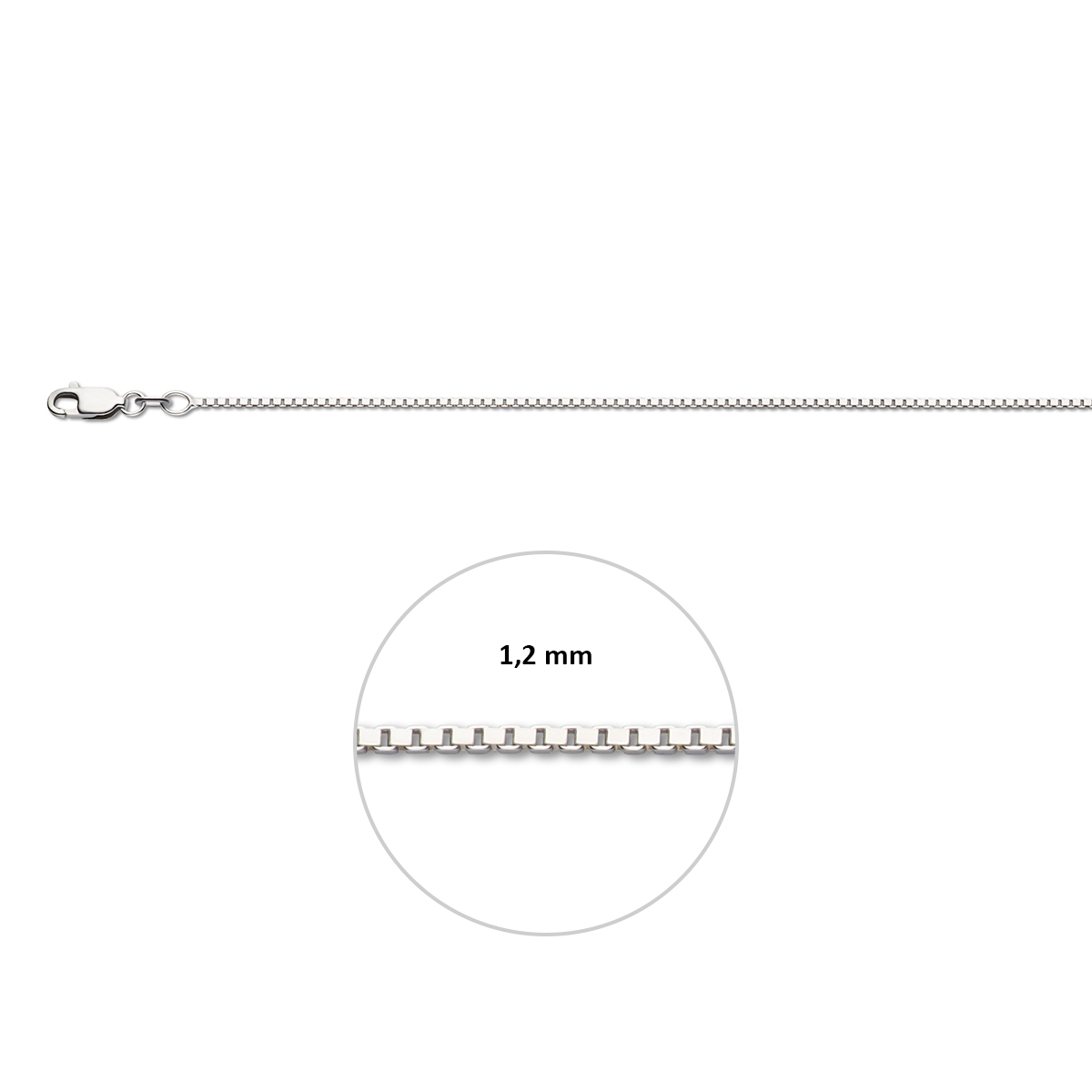 Gerhodineerd zilveren lengteartikel met venetiaanse schakel. De schakelbreedte is 1.2mm.